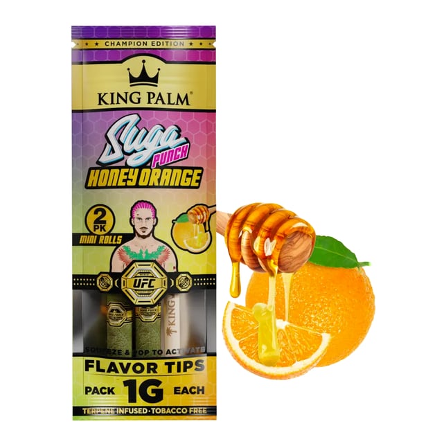 On August 19, 2023, Sean O'Malley secured the UFC Bantamweight Champion title. King Palm and Suga Sean, both champions in their realms, fight for their rightful place and have achieved fame. Try the new knockout palm roll flavor—a citrusy blend with honey, delivering a Suga Punch in every puff.