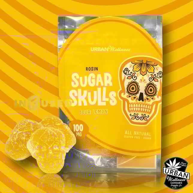 Each Sugar Skull bag is its own celebration of single source Rosin infused gummies! These delectable treats capture the essence of ripe oranges, offering a burst of tangy and refreshing taste in every bite. We invite you to enjoy while experiencing the desired entourage effect of the solventless full plant extract. The gummies themselves are made from all natural, vegan ingredients then infused with 100mg THC of Urban Wellness’ renowned Frozin, our signature Live Hash Rosin concentrate.